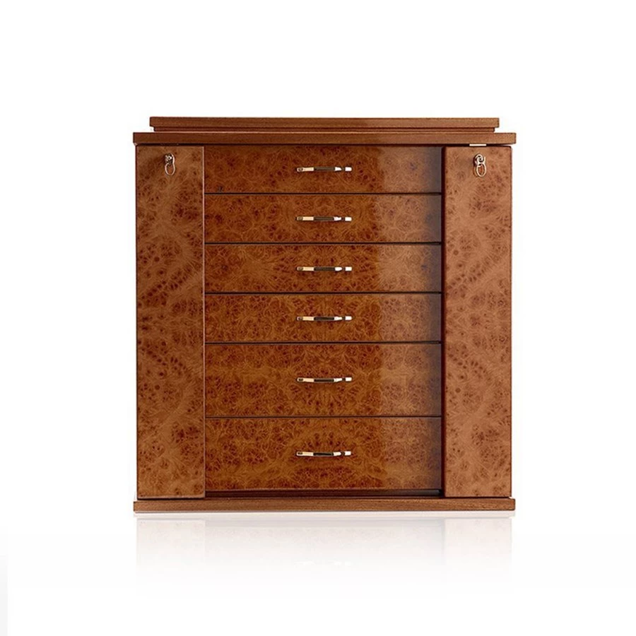 This jewelry chest in polished briarwood and mahogany is lined with ultra-suede and adorned with 24k gold-plated brass accessories. Inside there are necklace bars, lockable doors, 5 drawers, and an adjustable mirror on the top section. Handmade in Italy.