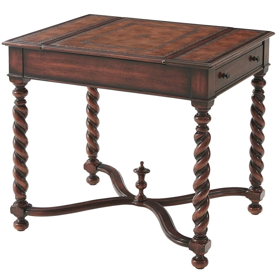 A hand carved mahogany game table and inlaid games table features a reversible hand tooled leather top with a chess board on the underside and a backgammon board below. The table holds bone and horn backgammon counters and handcarved wooden chess set, both included. Table has opposing end drawers and stands on impressive spiral turned legs joined by an ‘X’ stretcher.