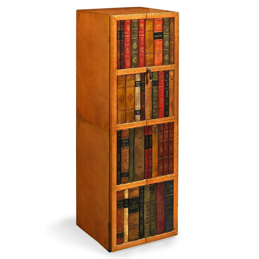 Fine antique Florentine hand-tooled leather over wood with reproduction book spines. This charming shelf of leather front books opens up by two doors to reveal the concealed iron safe within with shelves underneath. The safe features an electronic Yale lock to secure your treasured possessions. Hardware not included. Handmade in Italy. Designed by and exclusively at Scully & Scully. Please note that books may vary from shown.