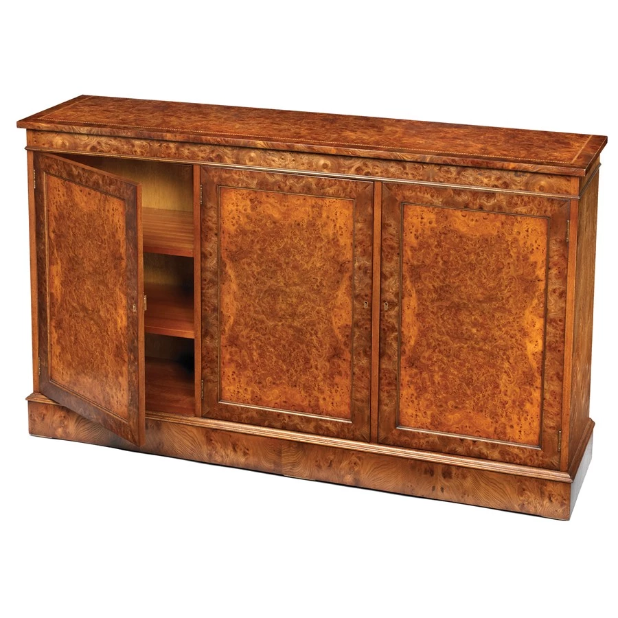 Solid craftsmanship defines this impressive piece handmade in England exclusively for Scully & Scully. Two adjustable shelves behind each door with brass hardware. Doors lock with key.