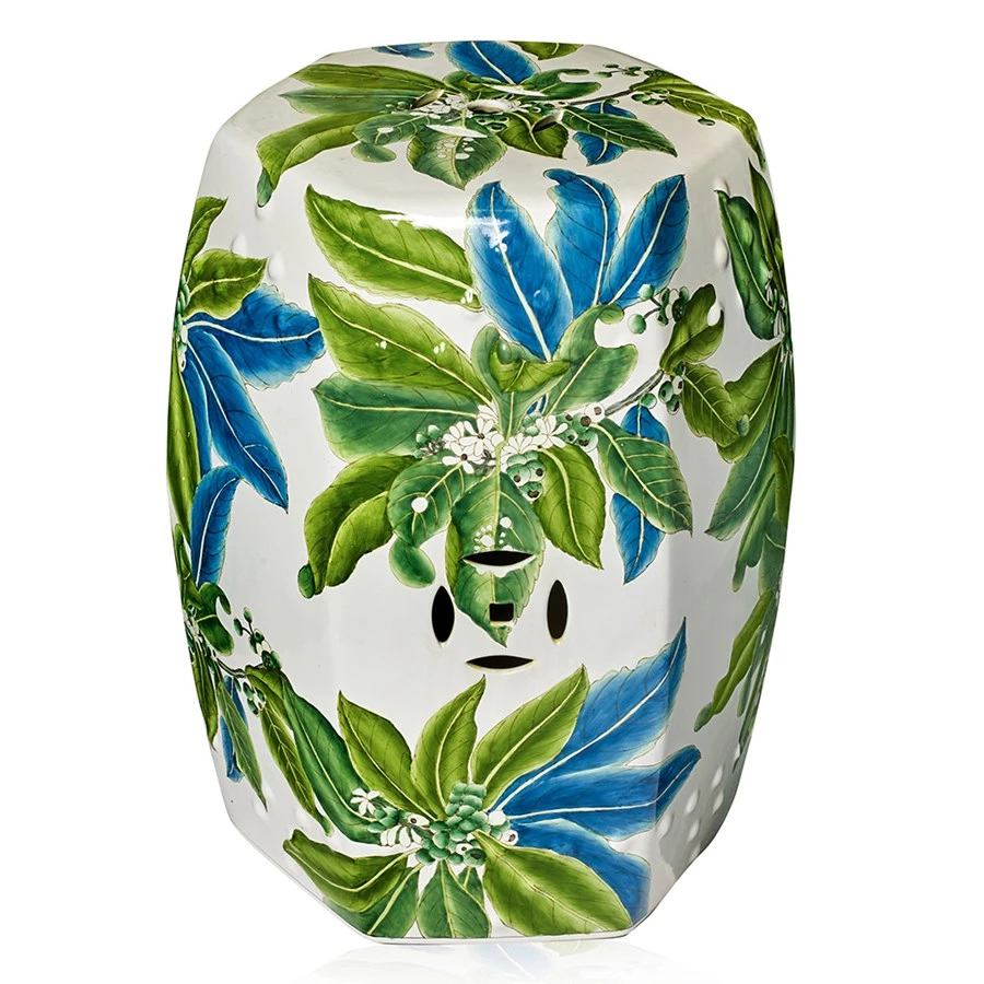 Off-white crackle glazed porcelain provides the perfect canvas for a riot of blue and green leaves, peppered with flowers and berries. Useful as a stool or as an extra table surface.