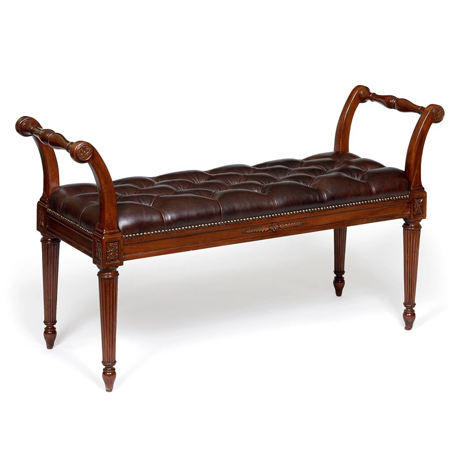 A very traditional tufted leather bench made of mahogany and has a nail head trim with tapered legs. Make sure your guests always have a comfortable seat.