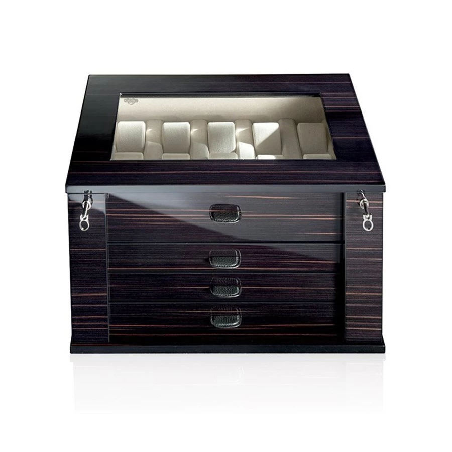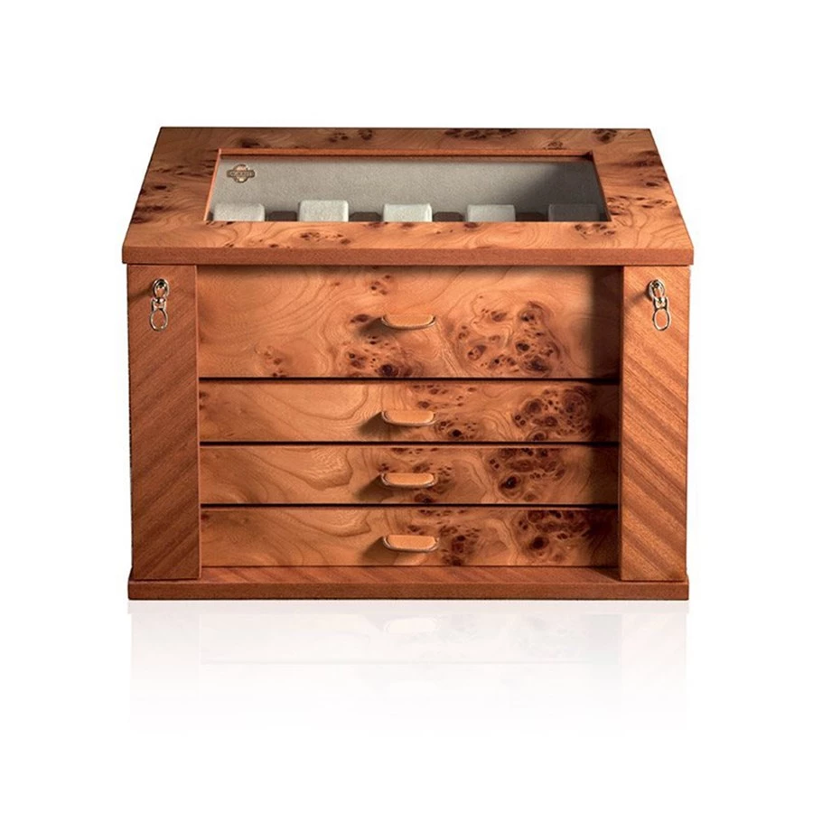 Store your watches in impeccable style. Each handsome chest has space for 28 watches to be placed in dedicated anti-tarnish suede-lined holders. The four drawers glide out for easy access and is lockable to secure your timepieces. Handmade in Italy by the finest craftsmen.