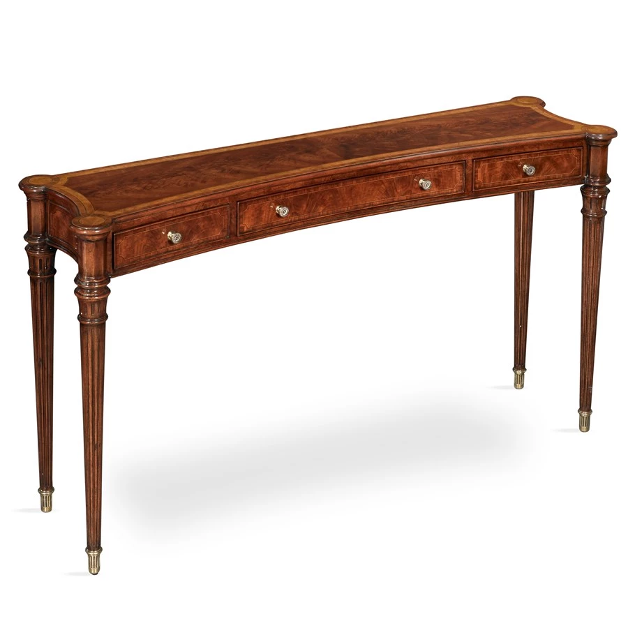 A fine flame walnut and yew burl veneered console table, the yew burl crossbanded top with a concave front and sides, with protruding rounded corners above three line strung frieze drawers, on turned and fluted tapering legs terminating in brass cappings. Inspired by an original Regency desk.